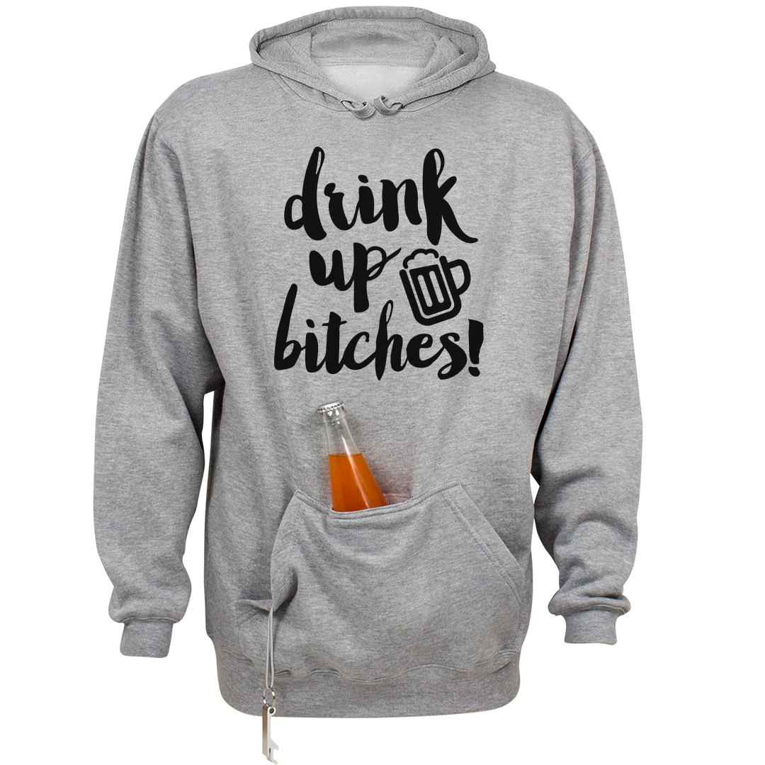 Drink up bitches! Rock this cozy, beer holder hoodie for all of your St. Patrick's Day shenanigans! Cozy up in this warm sweatshirt while you hit the pubs to celebrate.