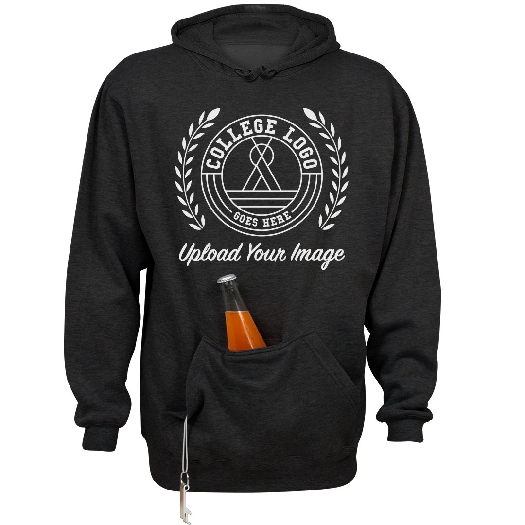 Upload your own image, photo, or logo to this super fun tailgate hoodie! You can also add text and choose art from our enormous library of art. This hoodie has a pocket to hold a beverage so it's perfect for tailgating during college football season. But you know, maybe you run the merch department for a small school, and maybe you don't have the same access to all the apparel options that larger schools might have. Well, you can upload your school logo for your merch program.