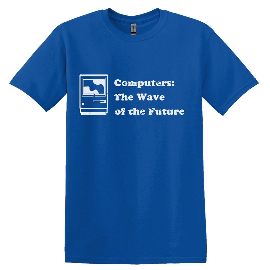 Some day everyone will own a computer in their house, and they will be able to use that computer to communicate with other computers around the world. We may even be able to use these 'networked' home computers to buy things from stores and have those items delivered right to our doorsteps! Until that day, though, we'll just have to make do with shirts imagining this glorious future...